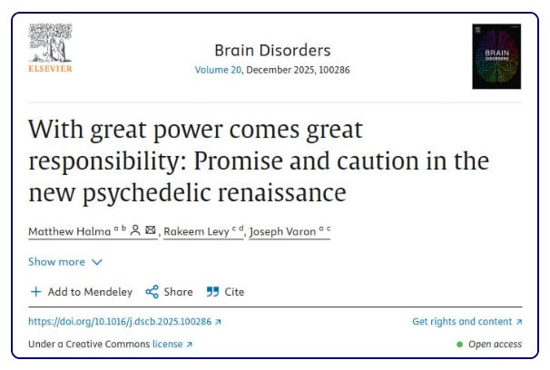 “Our hope is that this review will inform clinicians, policymakers, and the public about both the opportunities and the responsibilities inherent in this new therapeutic frontier. With careful stewardship, psychedelics could transform the landscape of mental health care.” — Halma, Levy, Varon