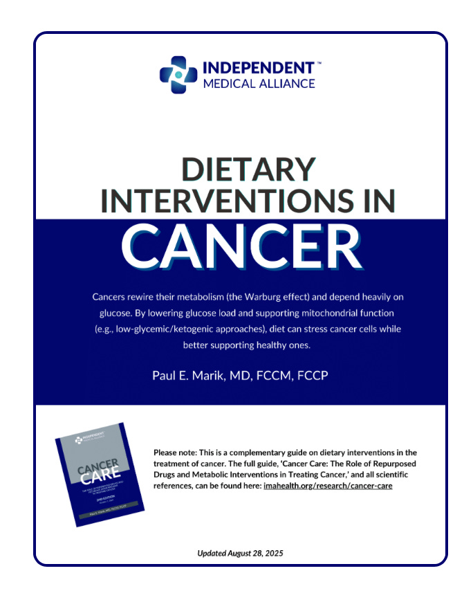 This is the core idea behind Dietary Interventions in Cancer, a new guide from IMA authored by Dr. Paul Marik. Based on decades of research and cutting-edge science, the guide outlines three powerful strategies rooted in cancer metabolism—designed not to replace conventional treatment, but to make it work better.