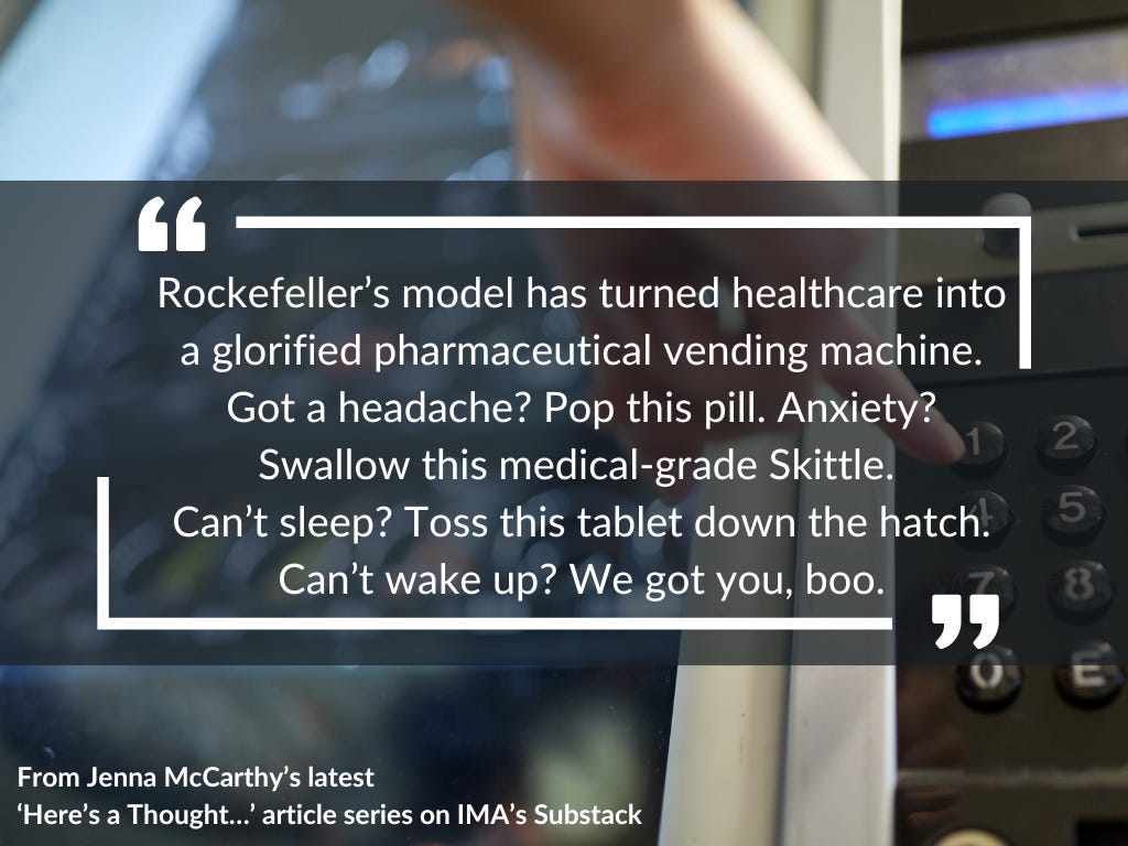 Rockefeller’s model has turned healthcare into a glorified pharmaceutical vending machine. Got a headache? Pop this pill. Anxiety? Swallow this medical-grade Skittle. Can’t sleep? Toss this tablet down the hatch. Can’t wake up? We got you, boo. Developed a twitch from the first intervention? Great news! We just developed a brand new engine-grade elixir just for twitching.