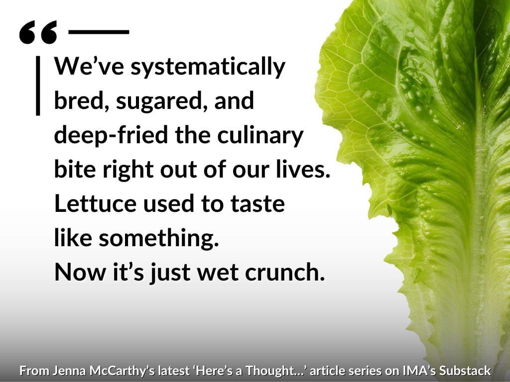 Once upon a time, our taste buds had range. They could detect subtle notes of bitterness in greens, herbs, and roots and respond like a well-trained orchestra—cue the stomach acid, roll out the bile, warm up the pancreas. Nowadays, those same buds are like retired musicians who only come out for a gig if there’s frosting involved. We’ve systematically bred, sugared, and deep-fried the culinary bite right out of our lives. Lettuce used to taste like something. Now it’s just wet crunch.