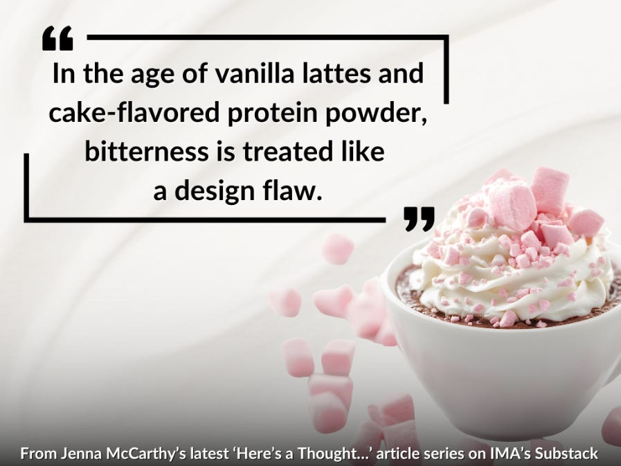 But in the age of vanilla lattes and cake-flavored protein powder, bitterness is treated like a design flaw. The truth is, the modern palate has evolved to appreciate all the complexity of a toddler’s snack tray. (For the record, it’s not entirely our fault—many naturally bitter plants are genuinely toxic, so the aversion is part learned preference, part survival instinct.)