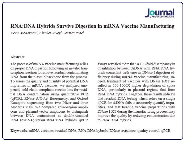 During mRNA vaccine production, DNA templates are used to generate the mRNA. That DNA is supposed to be destroyed afterward using an enzyme called DNase I. But here’s what the study demonstrates: DNase I cannot effectively digest DNA that has bonded with RNA to form what scientists call RNA:DNA hybrids.