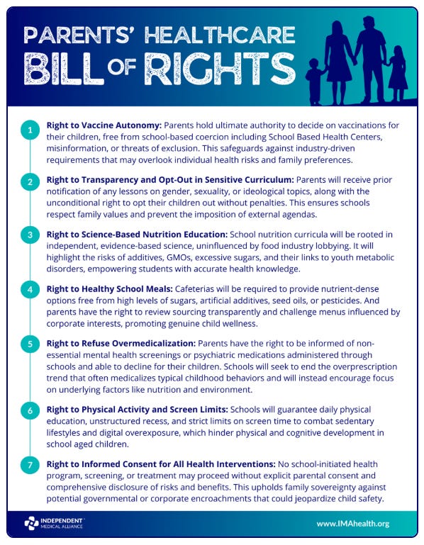 A central theme of these meetings was IMA’s request to collaborate on a federal Family Medical Freedom Act—a policy framework that merges Idaho’s newly enacted Medical Freedom Act (MFA) with IMA’s Parents’ Bill of Rights, forming a model national protection for families, students, and independent clinicians.