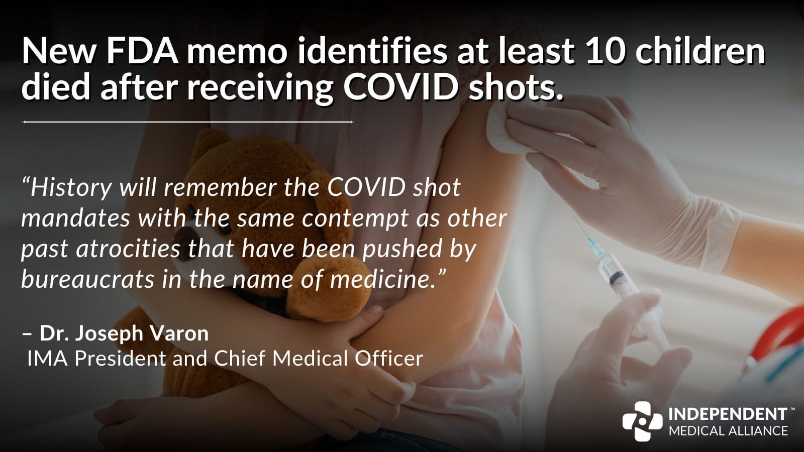 The Independent Medical Alliance (IMA), a national network of frontline physicians committed to transparency, evidence-based practice, and patient-centered reform, released the following statement today from IMA President and Chief Medical Officer Dr. Joseph Varon regarding the FDA weekend memo that identified at least 10 children who died after receiving the COVID-19 mRNA shot.