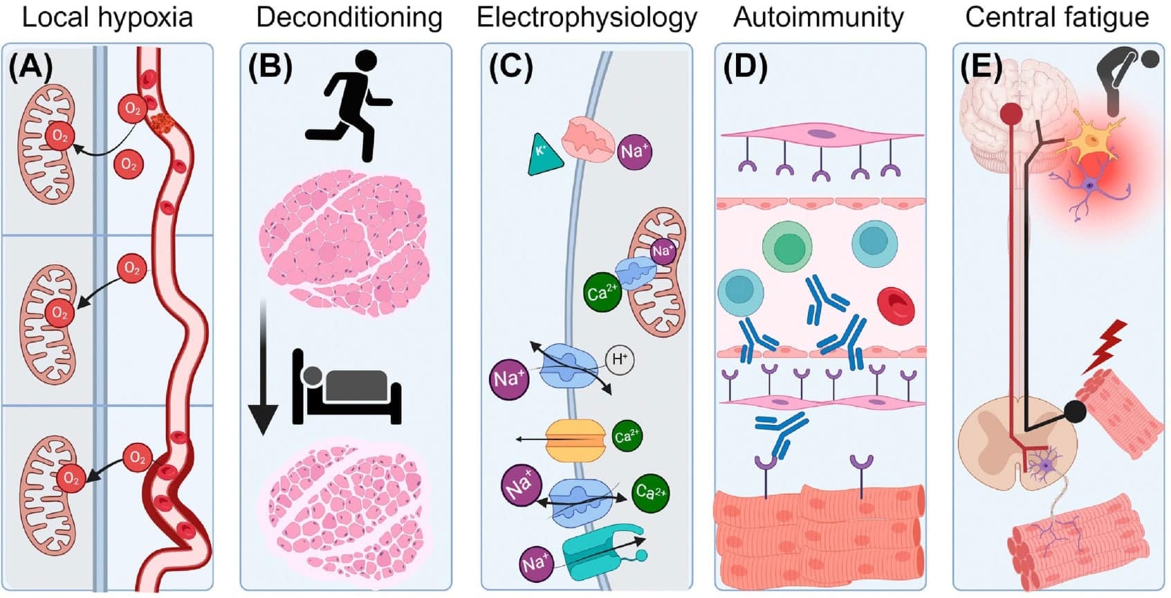One long COVID study offers a helpful visual model for how these mechanisms may function. The figure below illustrates contributing factors such as oxygen shortages, metabolic deconditioning, altered nervous system signaling, immune activation, and central fatigue. Together, they help make sense of what PACVS patients are experiencing.
