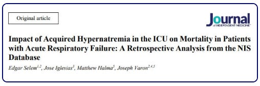 A new study published in the Journal of Independent Medicine analyzed data from over 150,000 hospitalizations and found that patients with acute respiratory failure who develop hypernatremia—elevated sodium levels—face nearly 50% higher mortality and hospital stays that more than double. The study was co-authored by an incredible team, including IMA/FLCCC co-founders Dr. Joseph Varon and Dr. Jose Iglesias, as well as IMA Director of Research Matthew Halma and newcomer Edgar Selemi.