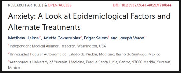 Published in the International Journal of Depression and Anxiety, this study by researchers at the Independent Medical Alliance, Dr. Joseph Varon and Matthew Halma, with students Arlette Covarrubias and Edgar Selem, explores the potential of ashwagandha, CBD, and saffron as safe, promising therapies for managing anxiety symptoms.