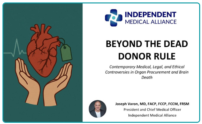 President and Chief Medical Officer of the Independent Medical Alliance. With nearly four decades of experience in critical care medicine, Dr. Varon has witnessed firsthand the ethical pressures facing transplant medicine. During his fellowship training, he repeatedly encountered patients declared brain dead who were clearly still alive. He advocates for the principle that “medicine must serve life, not redefine death.” Find more of Dr. Varon’s thoughts on the questions around organ donation below: